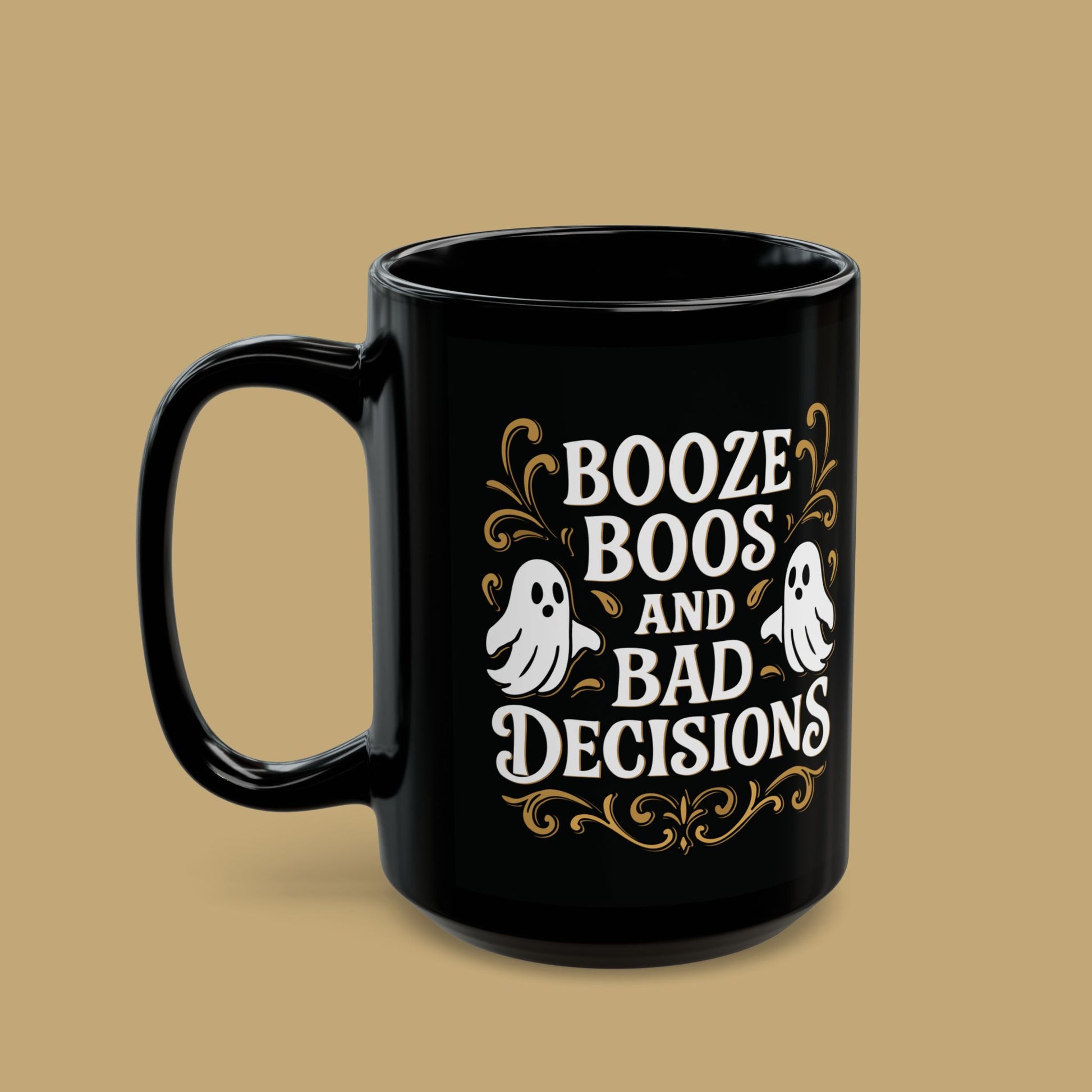 Sturdy ceramic mug available in 11oz or 15oz sizes. Glossy black finish with bold lettering, ornate swirls, and two mischievous little ghosts that stand up to both dishwasher and microwave use.