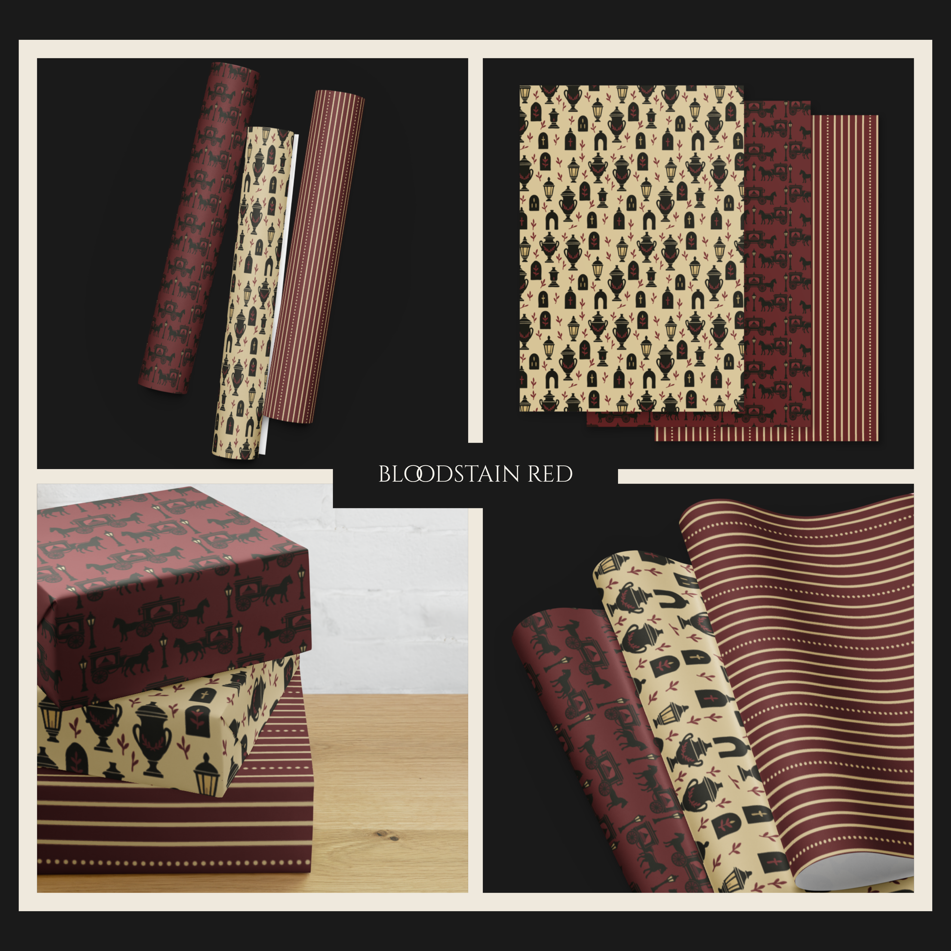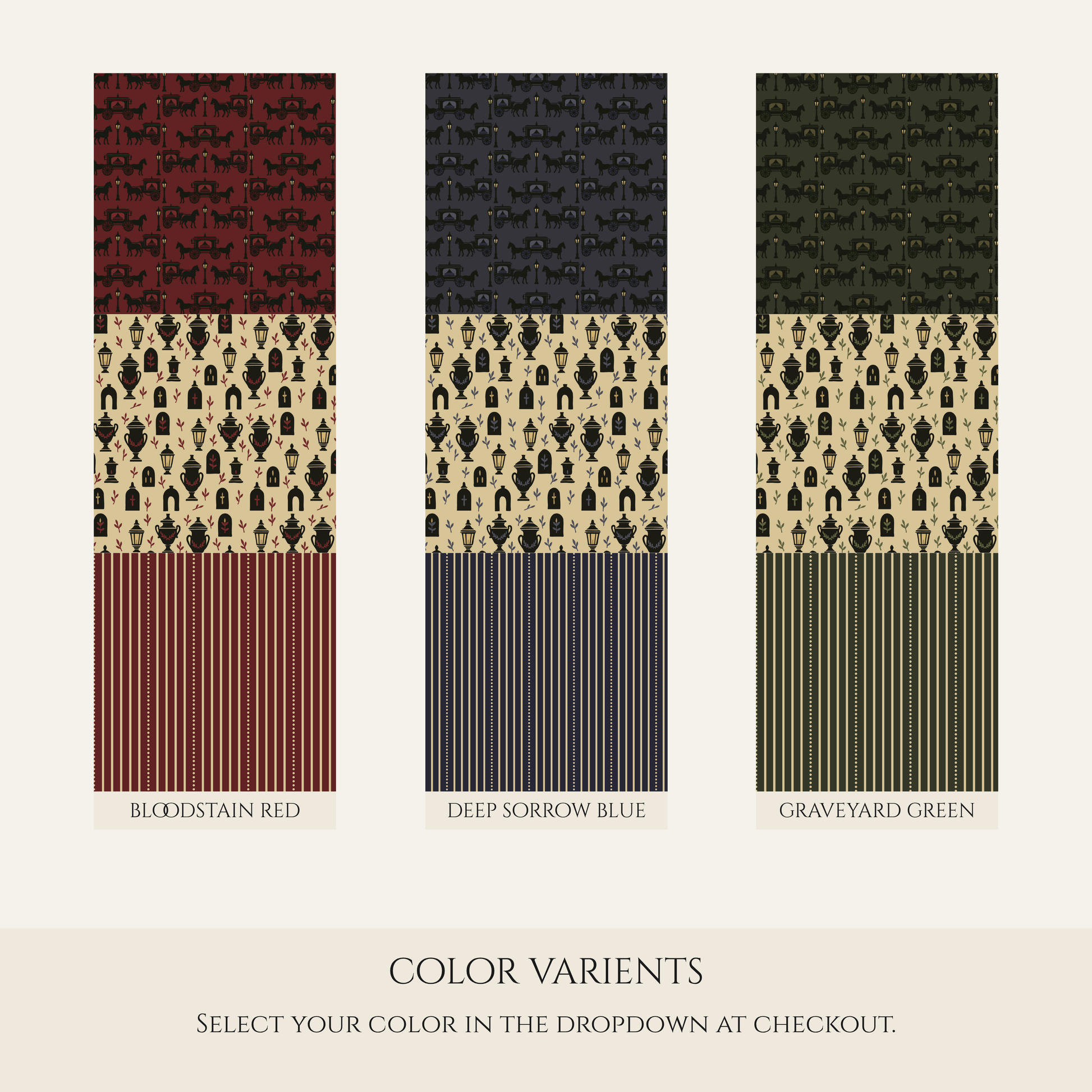 The Midnight Procession Wrapping Paper Set transforms ordinary gift wrap into something hauntingly beautiful — where Victorian hearses, lanterns, and garden urns meet deep, decadent hues and quiet ritual. Designed for those who find grace in the dark and style in the strange.