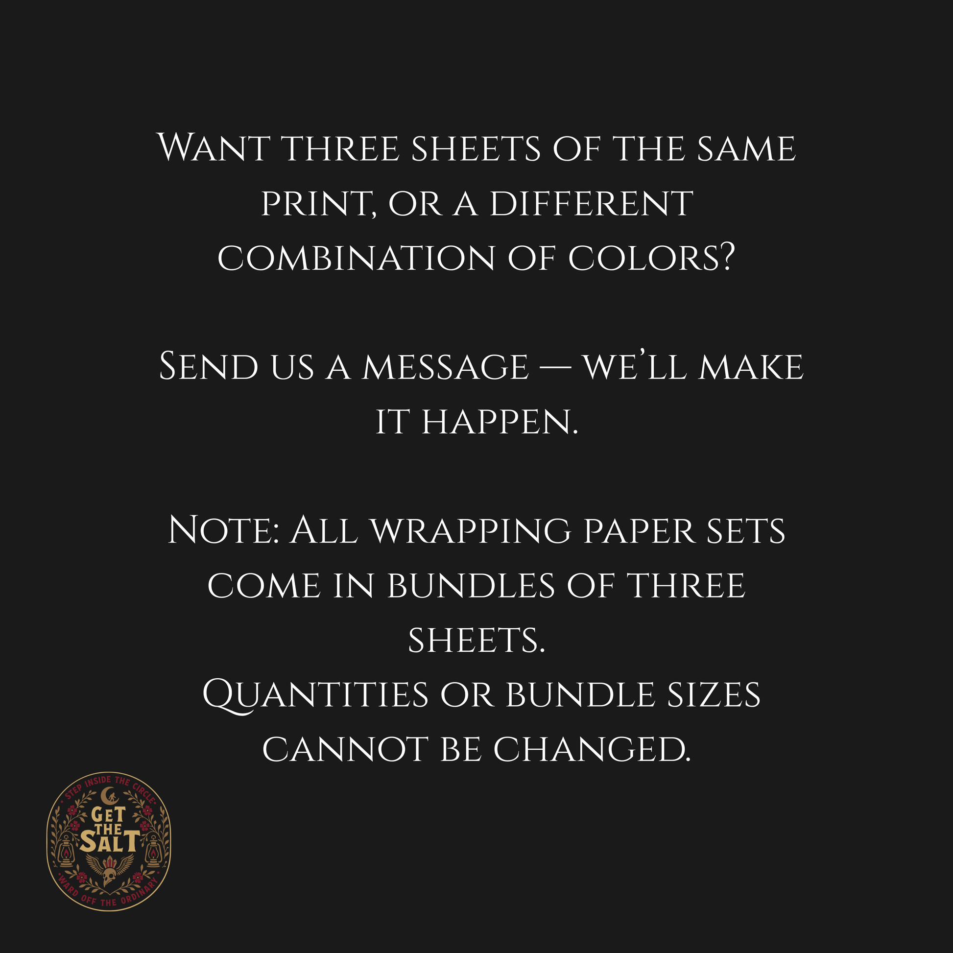 A coordinated set of 3 matte-finish wrapping sheets, each featuring an original design from the Midnight Procession collection: