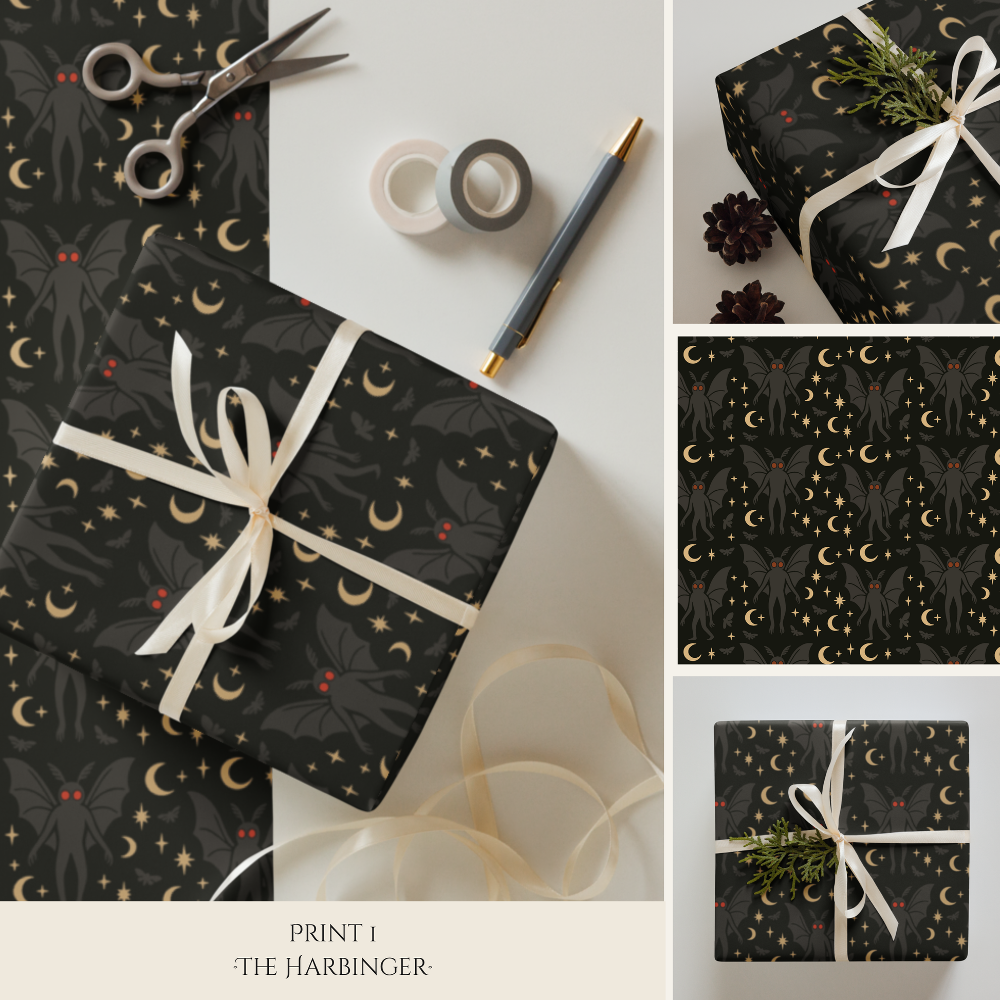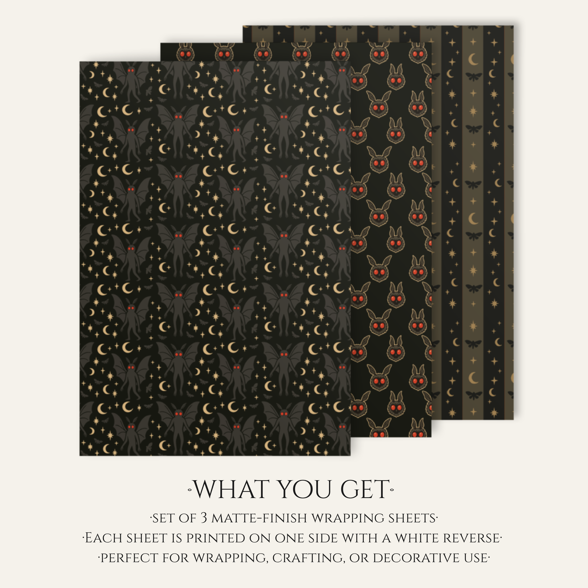 This set includes three matte-finish wrapping paper designs inspired by the legend of the Mothman. “Prophecy Stripes” features celestial columns of moons, stars, and winged omens, echoing Mothman’s prophetic origins. “Eyes in the Dark” reveals glowing red eyes and horned silhouettes watching from the void — ideal for true believers and cryptid hunters. “The Harbinger” captures the full-winged creature himself, surrounded by crescent moons and scattered stars in tones of midnight gold and shadow.