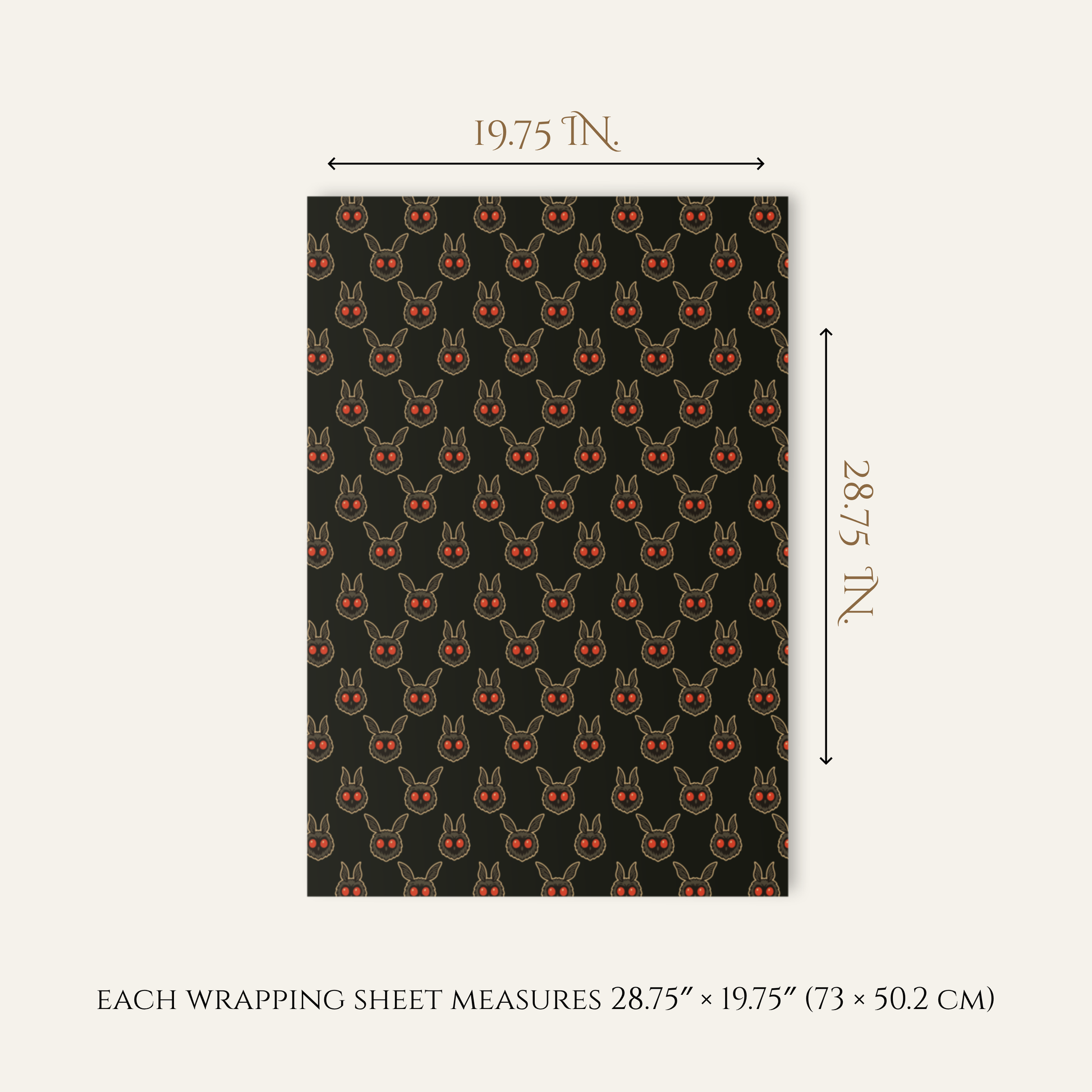 Each sheet is printed on 70# uncoated text paper, offering a smooth, premium matte finish — heavier than standard printer paper yet lighter than cardstock. The result is a durable, luxurious wrap with a refined texture and striking detail. Each sheet measures 28.75″ × 19.75″ (73 × 50.2 cm), large enough for medium boxes, books, or gifts meant for those who love the mysterious. Printed on one side with a clean white reverse for contrast.
