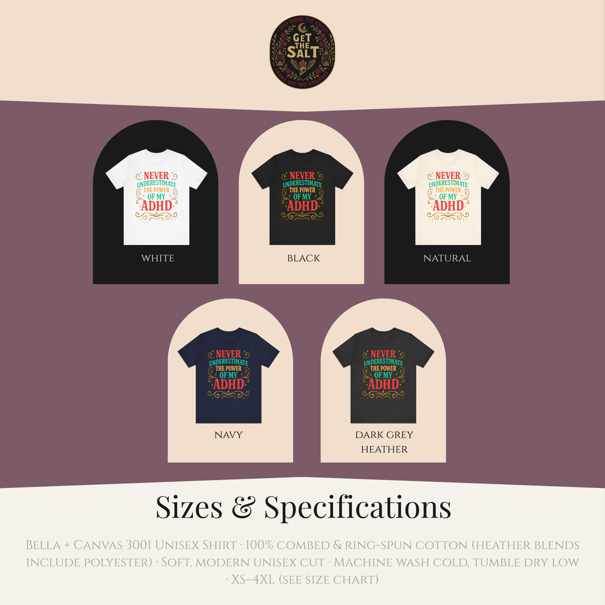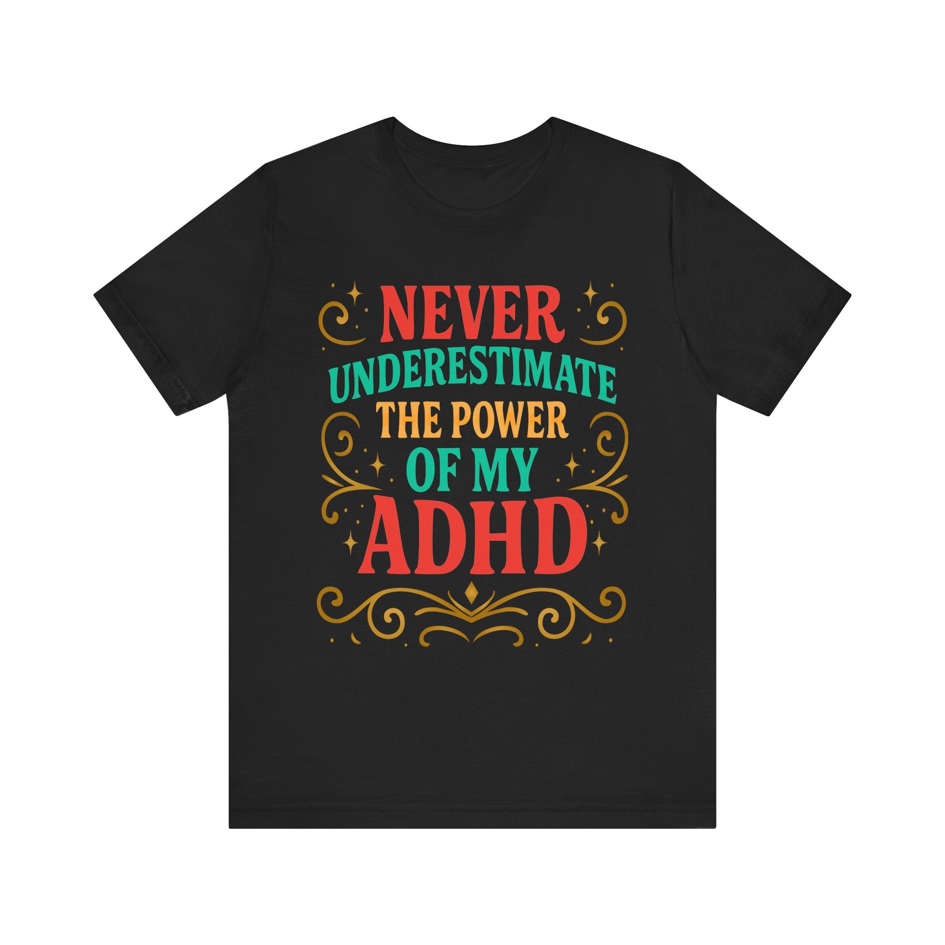 The Never Underestimate the Power of ADHD tee celebrates chaos as a properly fueled superpower. Bold, witty, and a badge of honor for the brilliantly distracted.